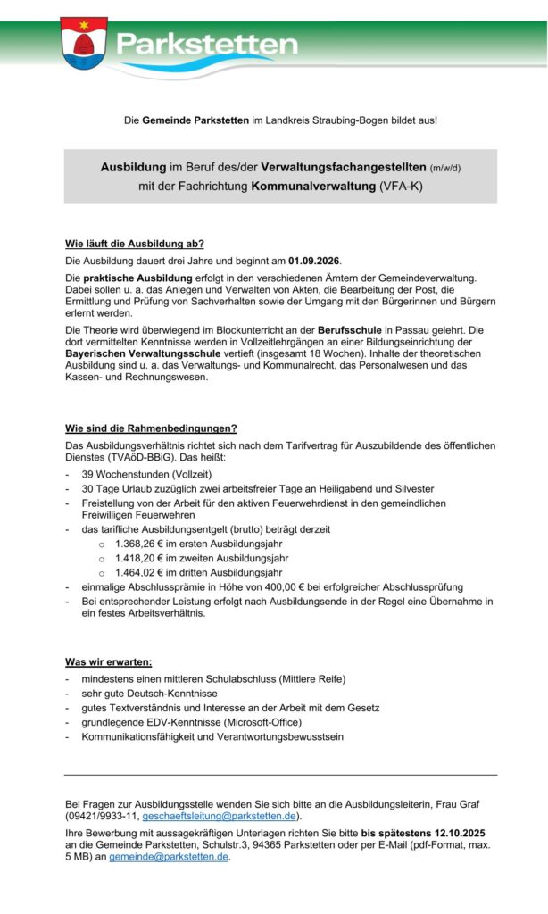 Stellenausschreibung – Ausbildung im Beruf des/der Verwaltungsfachangestellten (m/w/d)